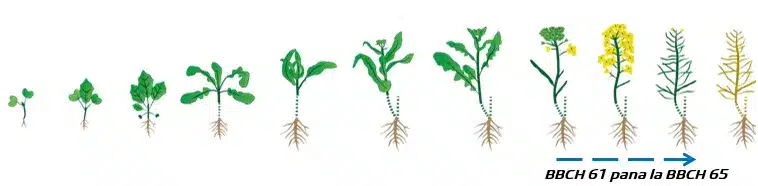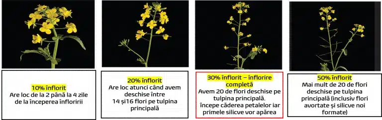 În majoritatea regiunilor țării, cultura de rapiță se află la începutul înfloritului (BBCH 57). Această etapa este marcată de deschiderea bobocilor florali și apariția florilor, care mai târziu vor forma silicve. Întreg procesul poate dura undeva între 14 și 21 de zile, cuprinzând mai multe etape, precum: