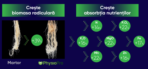 PHYSIO PRO este o tehnologie concepută să îmbunătățească fiziologia plantelor și absorbția nutrienților, care conține extracte de alge brune, fitohormoni și aminoacizi esențiali.