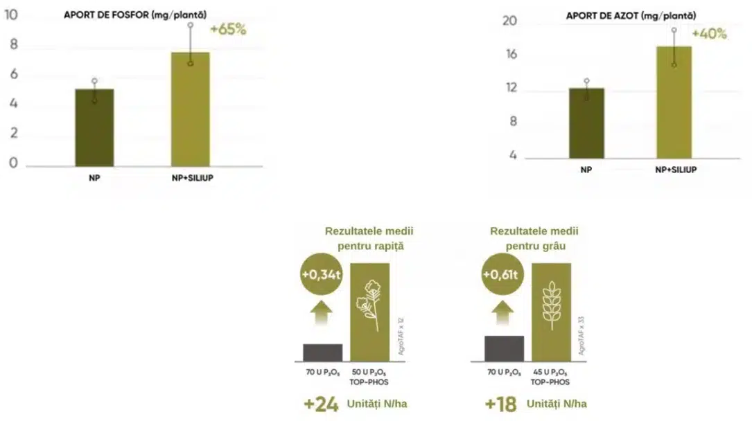 Testările arată o creștere cu 40% a absorbției de azot și o creștere cu 65% a absorbției de fosfor de către plantele care au fost bine aprovizionate cu siliciu aplicând Top-Phos Siliup.